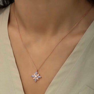 Gümüş Lila Taşlı Umut Çiçeği Kolye Umut çiçeği kolye, en yakın arkadaşınıza, sevdiğinize ya da en yakınlarınıza umudu simgeleyen muhteşem bir hediye seçeneği olabilir. Doğum günü hediyesi, sevgililer günü hediyesi veya özel günlerde tercih edilebilecek mükemmel bir seçenektir. Gümüş lila taşlı umut çiçeği bayan kolye 925 ayar gümüşten imal edilmiştir. Bu kolye üzerinde rose altın…