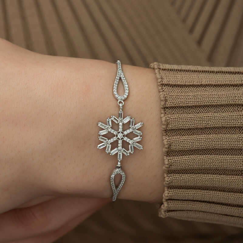 Kadınların ışıltısı, berraklığı kar tanesine benzetilip özel olarak tasarlanmıştır. Kar tanelerinin her birinin bayanlar gibi eşsiz ve ayrı kıymette olması onları özel kılan bir diğer özelliktir. Asilliği her dönemde dikkat çekmeyi başarmıştır. Bunun yanında insanların tıpkı kar taneleri gibi birbirlerine zarar vermeden de mutlu bir şekilde yaşayabileceklerini sembolize etmektedir. Bu şık bileklik; doğum günü hediyesi, sevgililer günü hediyesi veya annelere hediye olarak özel günlerde tercih edilebilecek mükemmel bir seçenektir. Bileklik, 925 ayar gümüşten imal edilmiştir. Gümüş üzerine rodyum kaplama yapılmıştır. Rodyum kaplama yapılan ürünler parlaklığını uzun süre muhafaza eder ve oksitlenmesi gecikir. Tüm gümüş bayan bilekliklerde olduğu gibi bu gümüş baget taşlı kar tanesi bayan bileklik de tamamı el emeği ile üretilmiştir. Gümüş ve değerli taşlar nedeniyle belirtilen ortalama ürün ağırlığında ± %10 sapma olabilmektedir.