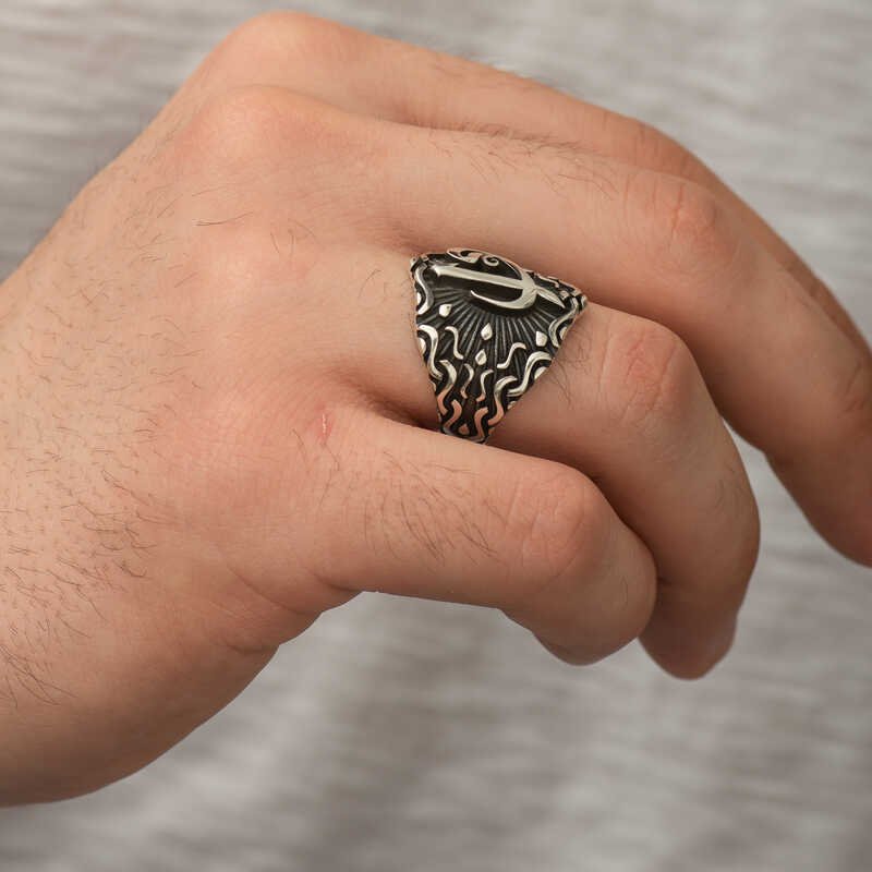 Her harfin sembolik bir anlamı vardır, tıpkı sayılar gibi… Allah’ın adı elif ile başladığı için diğer harfler gibi elif harfine soldan bir harf eklenemez. Allah’ın bir ve tek olduğunu simgelemektedir. Vav harfi ise anne karnında cenin pozisyonundaki bir kulu ve secdeye varan edepli bir kul anlamına gelir. Bu iki harf ve anlam beraber kullanılır. Vav gibi olmalı ilk yaradana bükülmeli, kulluk etmeyi bilmeli. Başlangıcımız vav gibi olmalı ilerleyişimiz elif gibi olmalı. Bu derin ve güzel anlamlardan yola çıkarak tasarladığımız elif vav erkek yüzüğü; kendinize ya da sevdiklerinize doğum gününde, babalar gününde ve özel günlerde tercih edebilirsiniz. Bu şık yüzük 925 ayar gümüşten imal edilmiştir. Gümüş üzerine oksit kaplama yapılmıştır. Oksit kaplama yapılan yüzükler parlaklığını uzun süre muhafaza eder. Tüm erkek yüzüklerde olduğu gibi gümüş elif vav erkek yüzük de el emeği ile üretilmiştir. Gümüş ve değerli taşlar nedeniyle ürün ağırlığında ± %10 sapma olabilmektedir.