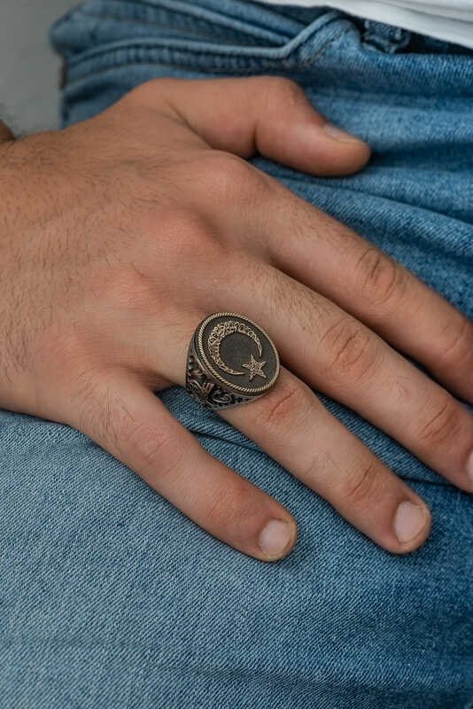 Göktürkler yani Göktürk Kağanlığı, 552 – 724 yılları arasında “Türk” adıyla kurulan ilk devlettir. Türk sözcükleri ilk kez bu dönemde taşlara kazınmıştır. Türk kelimesi ilk kez kullanıldığı Göktürkçe alfabesi ile Ay Yıldız Yüzük ile tasarlandı. Kolye; 925 ayar gümüşten imal edilmiştir. Gümüş üzerine oksit kaplama yapılmıştır. Oksit kaplama, gümüşe otantik bir görünüm vermektedir. Diğer kolyelerde olduğu gibi gümüş göktürkçe alfabesi yazılı Ay Yıldız erkek Yüzük de el emeği ile üretilmiştir. Gümüş ve değerli taşlar nedeniyle belirtilen ortalama ürün ağırlığında ± %10 sapma olabilmektedir.