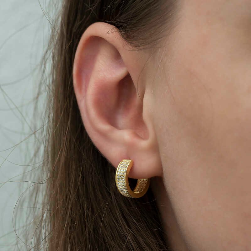 Hayatın her alanında kullanabileceğiniz minimal ince çizgilerden oluşturulan gold sıra taşlı halka küpe, kombinlerinize ışıltı ve şıklık katmak için sizleri bekliyor. Her yıl farklı trend tasarımlara imza atılıyor. Bu yılın en popüler modelleri ise çok taşlı ürünler olarak ön plana çıkıyor. Siz de bu şık küpeyi mücevher kutunuza kazandırabilir veya sevdiğiniz bir yakınınıza hediye olarak düşünebilirsiniz. Şık zirkon taşlı halka küpe, 925 ayar gümüşten imal edilmiştir. Gümüş üzerine altın kaplama yapılmıştır. Altın kaplama yapılan gümüş küpeler parlaklığını uzun süre muhafaza eder, oksitlenmesi gecikir. Üzerinde bulunan taşlar zirkondur. Tüm bayan gümüş ürünlerde olduğu gibi gümüş gold sıra taşlı halka küpe de el emeği ile üretilmiştir. Gümüş ve değerli taşlar nedeniyle belirtilen ortalama ürün ağırlığında ± %10 sapma olabilmektedir.