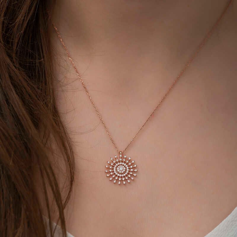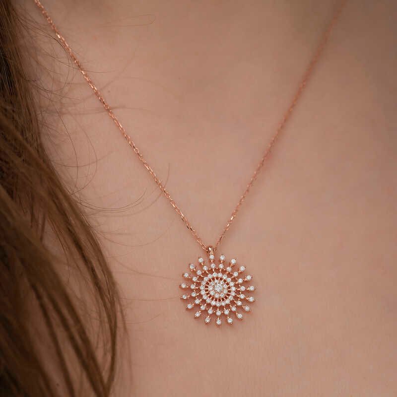 Güneş; ışığın, bilginin, iyiliğin, gücün ve yönetimin sembolüdür. Bu ışıl ışıl ve farklı tasarımıyla göz kamaştıran kolye; 925 ayar gümüşten imal edilmiştir. Gümüş üzerine rose altın kaplama yapılmıştır. Rose altın kaplama yapılan gümüş ürünler parlaklığını uzun süre muhafaza eder, oksitlenmesi gecikir. Gümüş beyaz taşlı güneş bayan kolye üzerinde bulunan taşlar zirkon’dur. Tüm gümüş kolyelerde olduğu gibi gümüş güneş bayan kolye de tamamı el emeği ile üretilmiştir. Gümüş ve değerli taşlar nedeniyle belirtilen ortalama ürün ağırlığında ± %10 sapma olabilmektedir.
