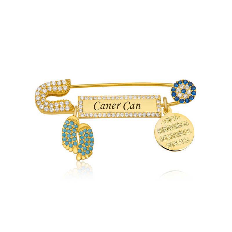 Farklı bir yeni doğan veya doğum günü hediyesi için birbirinden sevimli sevdiklerinize şık bebek yaka iğnesi hediye edebilirsiniz. Gümüş İsimli Bebek Yaka İğnesi ile çocukları bu dünyanın bir parçası haline getirebilirsiniz. Bebek iğnesinin üstünde nazar duası mevcuttur. Bu şık bebek iğnesi modeli 925 ayar gümüşten imal edilmiştir. Gümüş üzerine altın kaplama yapılmıştır. Altın kaplama yapılan gümüş bebek iğne modelleri parlaklığını uzun süre muhafaza eder ve oksitlenmesi gecikir. Ürünlerimizin tamamında olduğu gibi Gümüş isimli bebek yaka iğnesi modeli de tamamen el emeği ile üretilmiştir. Gümüş ve değerli taşlar nedeniyle belirtilen ortalama ürün ağırlığında ± %10 sapma olabilmektedir.
