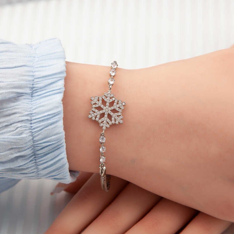 Kadınların ışıltısı, berraklığı kar tanesine benzetilip özel olarak tasarlanmıştır. Kar tanelerinin her birinin kadınlar gibi eşsiz ve ayrı kıymette olması onları özel kılan bir diğer özelliktir. Kar tanesinin asilliği her dönemde dikkat çekmeyi başarmıştır. Bunun yanında insanların tıpkı kar taneleri gibi birbirlerine zarar vermeden de mutlu bir şekilde yaşayabileceklerini sembolize etmektedir. Bu şık bileklik; doğum günü hediyesi, sevgililer günü hediyesi veya annelere hediye olarak özel günlerde tercih edilebilecek mükemmel bir seçenektir. Bileklik, 925 ayar gümüşten imal edilmiştir. Gümüş üzerine rodyum kaplama yapılmıştır. Rodyum kaplama yapılan ürünler parlaklığını uzun süre muhafaza eder ve oksitlenmesi gecikir. Tüm gümüş bilekliklerde olduğu gibi bu gümüş rodyum kar tanesi kadın bileklik de tamamı el emeği ile üretilmiştir. Gümüş ve değerli taşlar nedeniyle belirtilen ortalama ürün ağırlığında ± %10 sapma olabilmektedir.