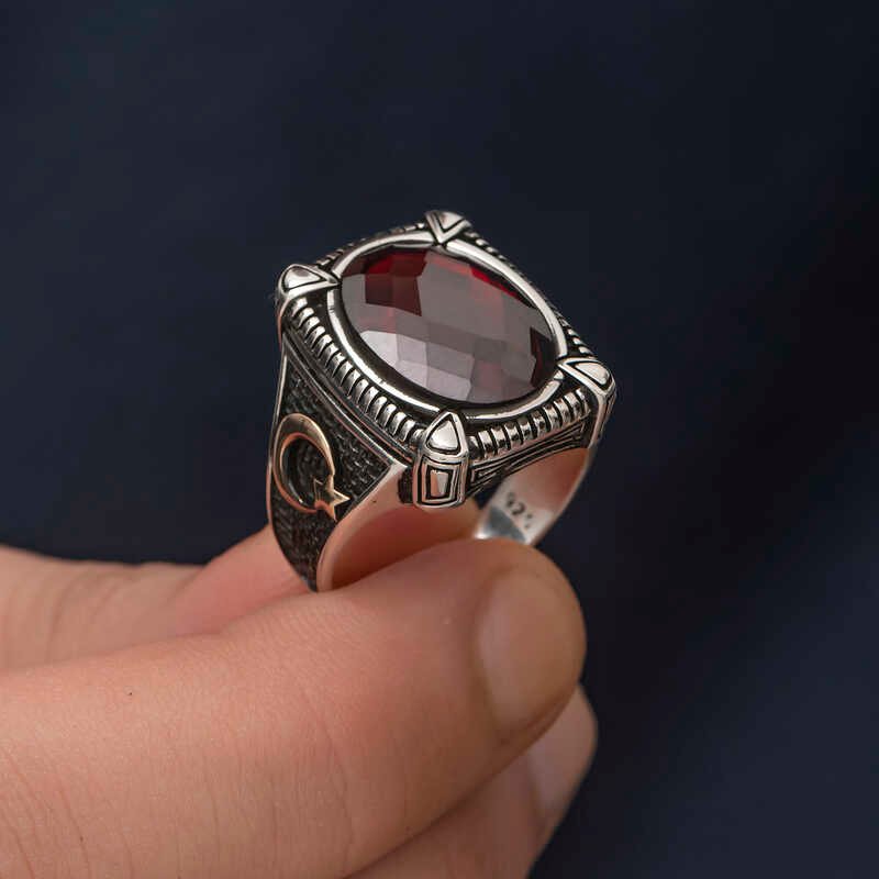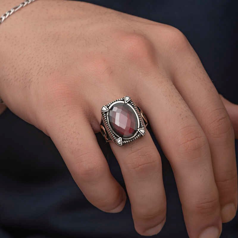 Gümüş Kırmızı Zirkon Taşlı Erkek Yüzük