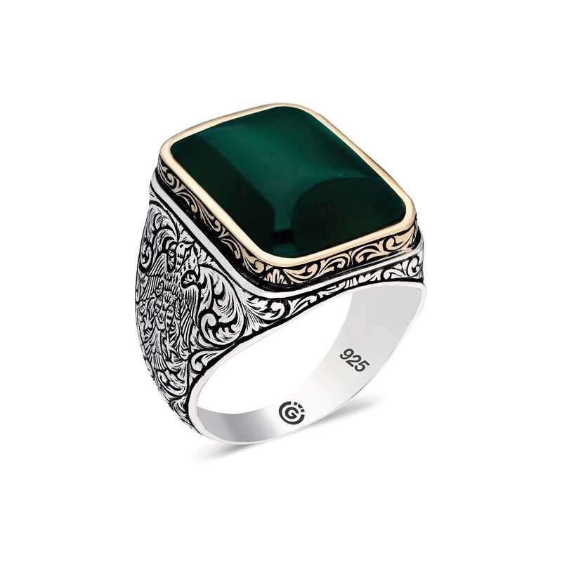 Gümüş Koyu Yeşil Akik Taşlı Kare Erkek Yüzük