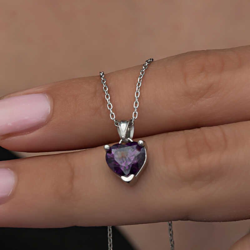 Gümüş Mor Taşlı Kalpli Kadın Kolye