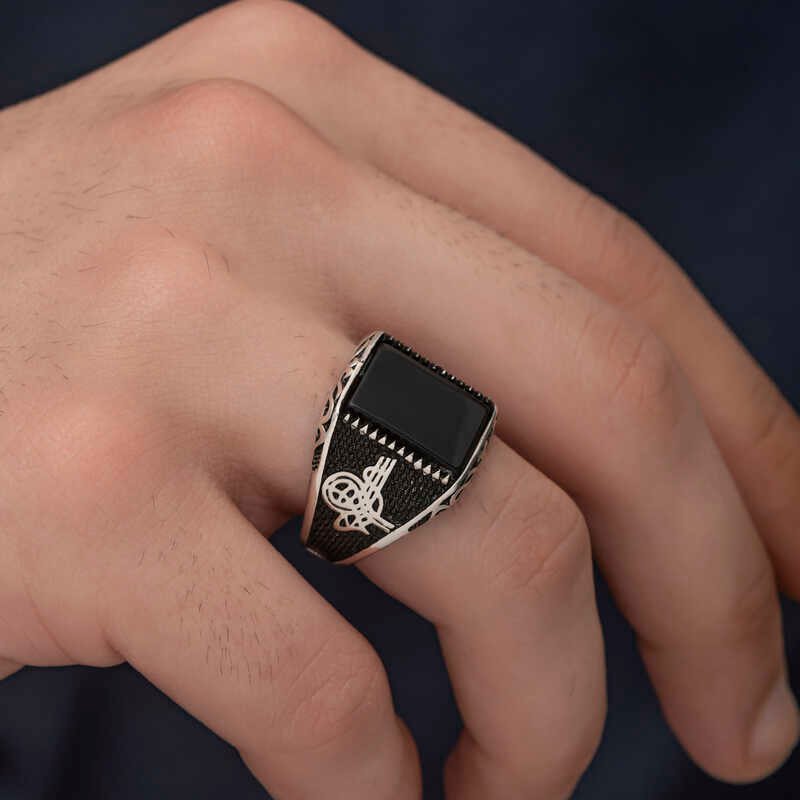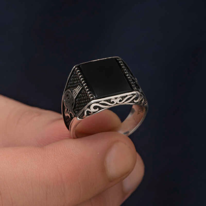 Gümüş Oniks Taşlı Tuğra Erkek Yüzük