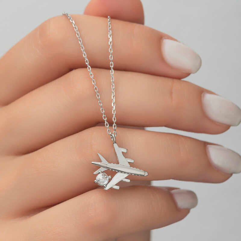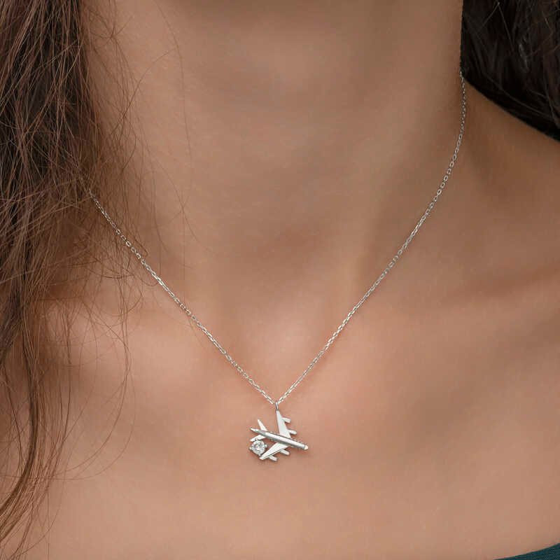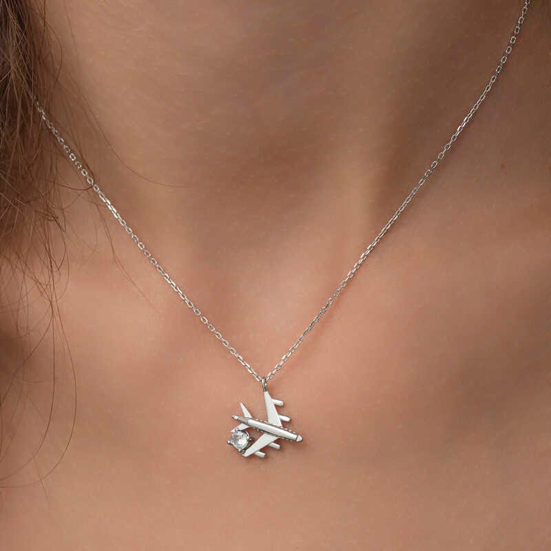 Gümüş Rodyum Tek Taşlı Uçak Kadın Kolye