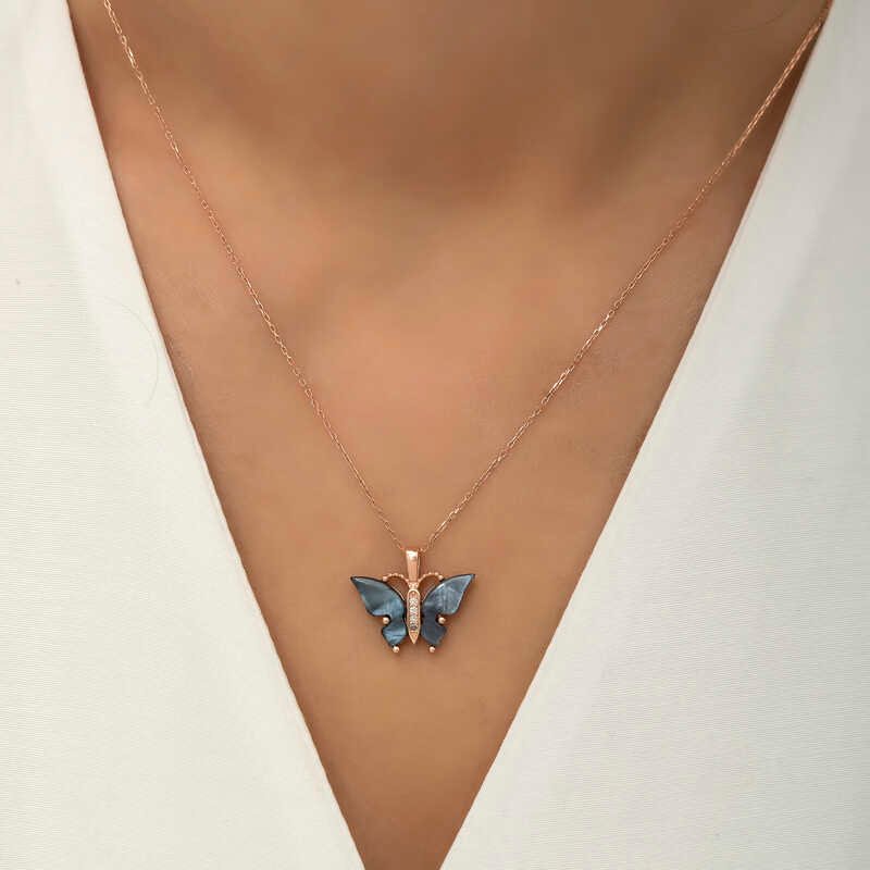 Gümüş Rose Antrasit Kaplangözü Taşlı Kelebek Kolye