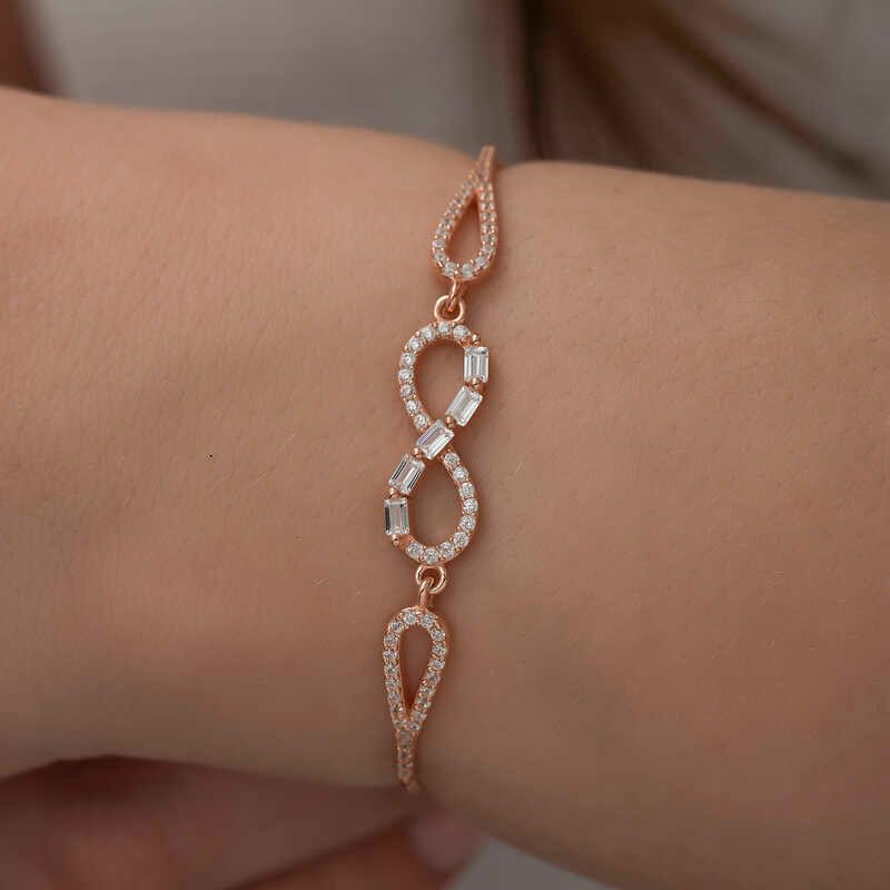 Sonsuza kadar sürecek aşkı anlatmanın en güzel yollarından biri de sevdiklerinize sonsuzluk sembollü gümüş takılar hediye etmektir. Sonsuzluk sembolü ebedi aşkın ve sadakatin işareti olarak evlilik yıl dönümü veya sevgililer günü gibi özel günlerde alınabilecek anlamlı hediyelerinden biridir. Baget taşlı sonsuzluk bayan bileklik 925 ayar gümüşten imal edilmiştir. Gümüş üzerine rose kaplama yapılmıştır. Rose kaplama yapılan gümüş bayan kolye modelleri parlaklığını uzun süre muhafaza eder ve oksitlenmesi gecikir. Bileklik üzerinde bulunan taşlar baget ve zirkondur. Gümüş baget taşlı sonsuzluk bayan bileklik tamamı el emeği ile üretilmiştir. Tüm bayan gümüş bileklik modellerinde olduğu gibi gümüş baget taşlı sonsuzluk bileklik el emeği ile üretilmiştir. Gümüş ve değerli taşlar nedeniyle belirtilen ürün ağırlığında ± %10 sapma olabilmektedir.