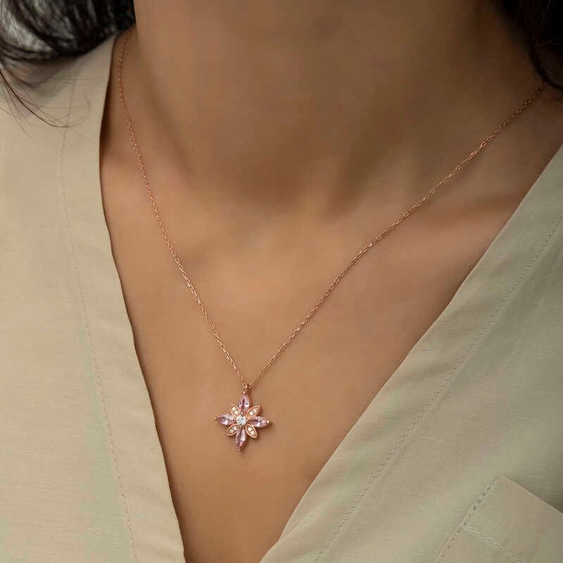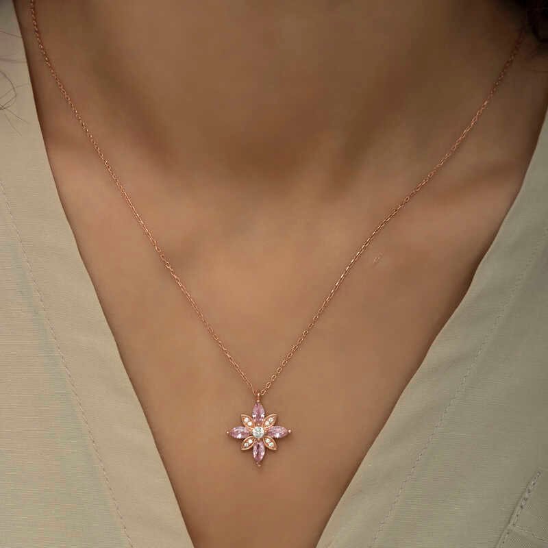 Gümüş Rose Pembe Taşlı Umut Çiçeği Kolye
