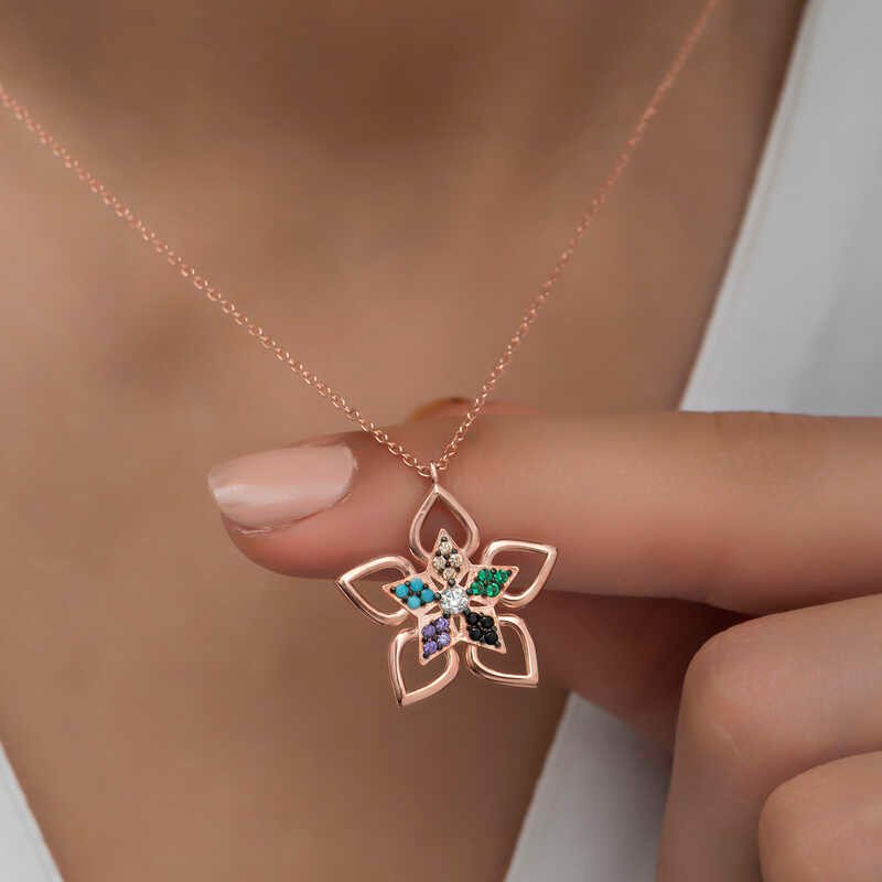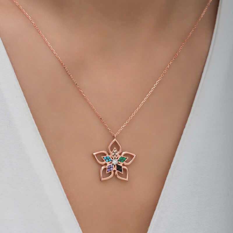 Gümüş Rose Renkli Taşlı Çiçek Kadın Kolye