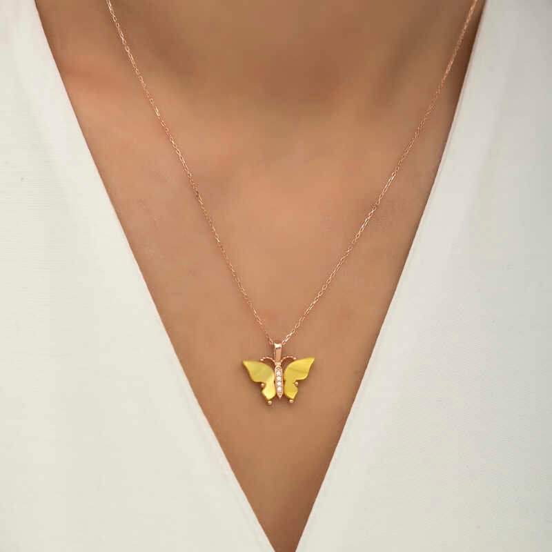 Gümüş Rose Sarı Kaplangözü Taşlı Kelebek Kolye