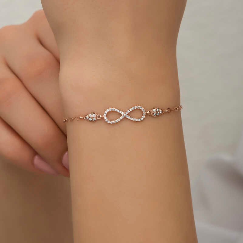 Gümüş zirkon taşlar ve sonsuzluk modelinin bir araya geldiği sevdiklerinize sevginizi gösterebileceğiniz şık ve anlamlı bir hediye olacaktır. Bu sonsuzluk model bileklik üzerine rose kaplama yapılmıştır. Rose kaplama yapılan gümüş kadın bileklik modelleri parlaklığını uzun süre muhafaza eder ve oksitlenmesi gecikir. Kadın bileklik modellerinin tamamında olduğu gibi gümüş sonsuzluk kadın bileklik modeli de el emeği ile üretilmiştir. Gümüş ve değerli taşlar nedeniyle belirtilen ortalama ürün ağırlığında ± %10 sapma olabilmektedir.