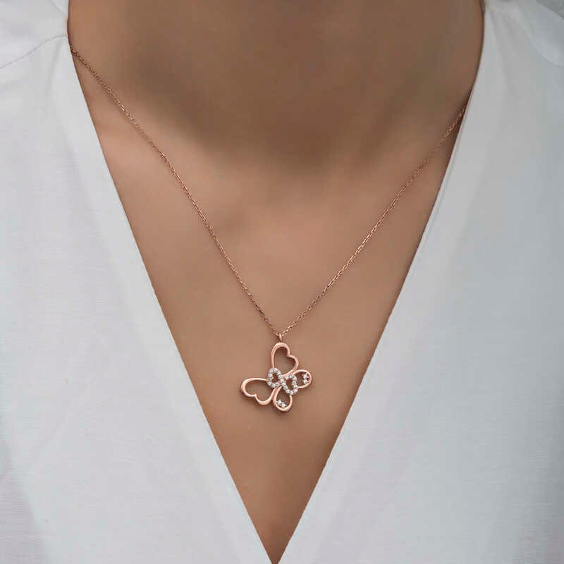 Kelebek kolye tertemiz sevginin ve aşkın ifadesidir. Sonsuz sevginizi sevdiğinize gösterebileceğiniz bir kolye modelidir. Sevdiklerinize alabileceğiniz anlamlı bir hediye bu şık kelebek kadın kolye 925 ayar gümüşten imal edilmiştir. Gümüş üzerine rose kaplama yapılmıştır. Rose kaplama yapılan gümüş kadın kolye modelleri parlaklığını uzun süre muhafaza eder ve oksitlenmesi gecikir. Kolye üzerinde bulunan beyaz taşlar zirkondur. Gümüş olan zincir boyu ortalama 45 cm’dir. Gümüş sonsuzluk kelebek kadın kolye modeli diğer tüm gümüş kadın kolye modellerinde olduğu gibi el emeği ile üretilmiştir. Gümüş ve değerli taşlar nedeniyle belirtilen ortalama ürün ağırlığında ± %10 sapma olabilmektedir.