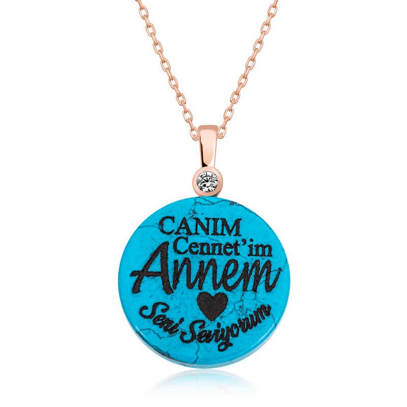 ​Gümüş Rose Turkuaz Taşlı Annem Yazılı Kadın Kolye