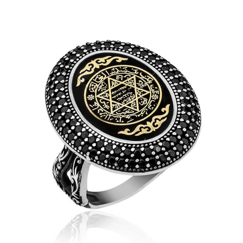 Bu mührün bulunduğu yüzük, Adem a.s.’ın kullandığı ve dünyaya gelirken cennette bıraktığı, daha sonra Cebrail a.s tarafından Cenab-Hakkın izniyle Davud a.s.’a getirilmiştir. Oğlu Süleyman a.s layık olduğundan ona verilmiştir. Öncelikle yüce Allah’ın ın celal ve cemal sıfatlarını sembolize eder. Bu mühür remizdir, rahmani bir semboldür. Siz de Gümüş Süleyman Mührü Yüzüğü sevdiklerinize armağan edebilirsiniz. Gümüş üzerine oksit kaplama yapılmıştır. Ürünlerimizin tamamı el emeği ile üretilmiştir. Gümüş ve değerli taşlar nedeniyle belirtilen ortalama ürün ağırlığında ± %10 sapma olabilmektedir.