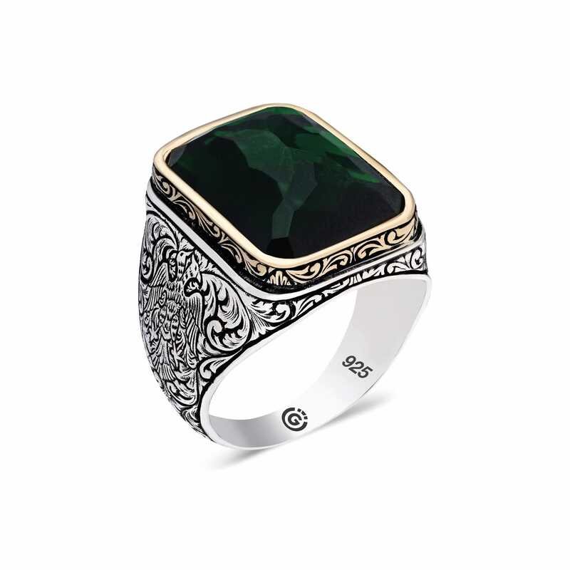 Gümüş Zirkon Yeşil Taşlı Kare Erkek Yüzük