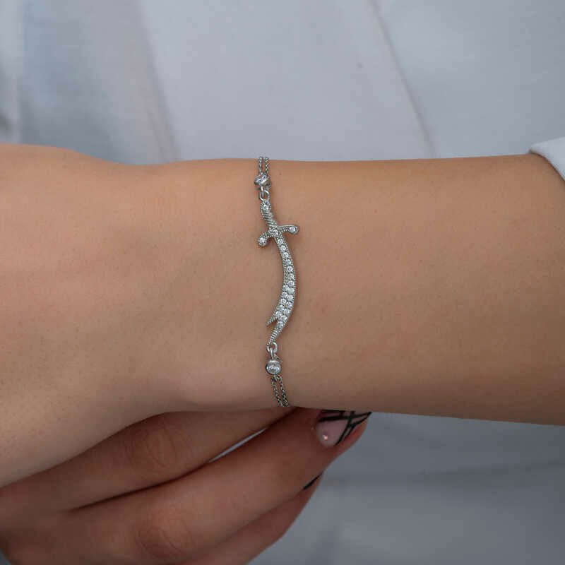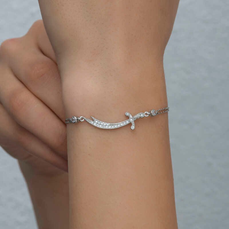 Hz. Ali Uhud savaşında çokça kahramanlık göstermiştir. Savaşta Peygamber Efendimizi korumak isterken kılıcı kırılır.Bunu gören Peygamber Efendimiz kendi kılıcı olan Zülfikar’ı kendisine vermiştir. Kılıcın keskinliği ile diğer kılıçları ortadan ikiye ayırmış ve savaşlarda destanlar yazdırmıştır. Hz. Ali Zülfikar kılıcıyla beraber savaşlardadır artık… Hz.Ali’nin vefatından sonra kılıcın cennete götürüldüğüne inanılıyor. Bir başka rivayete göre ise Dicle ve Fırat nehirlerinin arasında olduğu biliniyor. İslam ordularına hükmedecek kişi o kılıcın sahibi olup orduların başkomutanı olacaktır. Bu maneviyatla hazırlanmış olan bu tasarım çok dikkat çekicidir. Bu şık bileklik; doğum günü hediyesi, sevgililer günü hediyesi veya annelere hediye olarak özel günlerde tercih edilebilecek mükemmel bir seçenektir. Zülfikar kılıcı kadın bileklik modeli 925 ayar gümüşten imal edilmiştir. Bu özel tasarım üzerinde bulunan taşlar zirkondur. Bu kadın gümüş bileklik üzerine rodyum kaplama yapılmıştır. Rodyum kaplama yapılan bileklikler parlaklığını uzun süre muhafaza eder, oksitlenmeyi geciktirir. Tüm gümüş bilekliklerde olduğu gibi bu gümüş Zülfikar kılıcı kadın bileklik modeli de el emeği ile üretilmiştir. Gümüş ve değerli taşlar nedeniyle belirtilen ortalama ürün ağırlığında ± %10 sapma olabilmektedir.